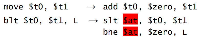 汇编器中本来不存在的指令,但是为了简化汇编语言而出现的一些“汇编指令”,这些“新的指令”由原来的指令组合形成。这些指令可能会使用到一些临时的寄存器,这个寄存器是 $at ,专门提供给这些汇编器伪指令使用,程序员在写程序的过程中不能使用这个寄存器。